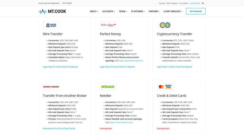 | 入金方法 | Bank Wire (BankTransfer/SWIFT), Bitcoin, Ether/Ethereum, PerfectMoney, NETELLER, Tether (USDT) |